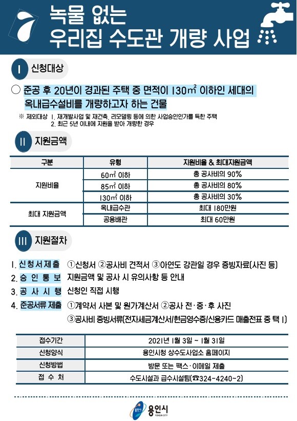 시 관계자는 “경제적 부담으로 노후 수도관을 사용하고 있는 가구의 많은 신청을 기대한다”며 “모든 시민이 깨끗하고 안전한 물을 공급받을 수 있도록 지원을 아끼지 않겠다”고 말했다.