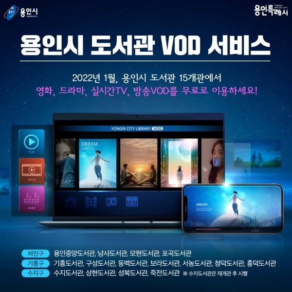 시 관계자는 “기존 DVD 대출과 함께 VOD 서비스 도입으로 최신 영상정보를 더욱 쉽고 빠르게 제공할 수 있게 됐다”며 “앞으로도 시민들의 눈높이에 맞는 정보 제공으로 도서관 서비스의 질을 향상시키겠다”고 말했다.