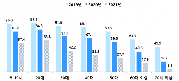 이에 따라 ‘문화예술행사 직접 관람률’은 33.6%로 전년 대비 27%포인트 감소하고 매체를 이용한 간접 관람 횟수는 32.4회로 전년 대비 6.8회 증가하는 등 국민의 문화예술 향유와 여가활동의 중심이 비대면으로 이동한 것으로 나타났다.