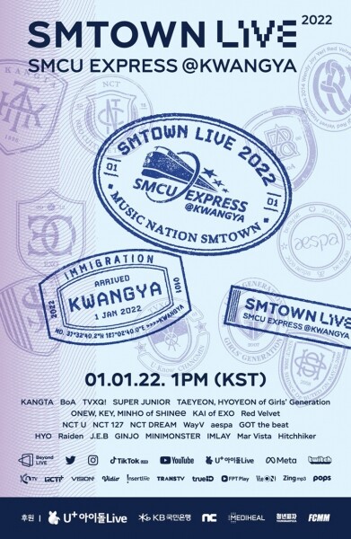 오는 1월 1일 오후 1시 ‘SMTOWN LIVE 2022 : SMCU EXPRESS@KWANGYA’는 유튜브, 틱톡, 트위치, 트위터, 인스타그램, 페이스북, 새롭게 런칭하는 Beyond LIVE 전용 글로벌 플랫폼, LG U+ 아이돌 라이브 앱/웹 등을 통해 전 세계 무료로 중계되어 전 세계 팬들의 뜨거운 관심이 기대된다.