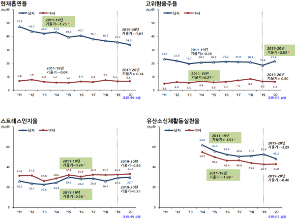 연령별 변화는 남자 30대에서 비만 증가, 유산소신체활동실천율 감소, 40대에서 고위험음주율과 고콜레스테롤혈증 증가가 뚜렷했다.