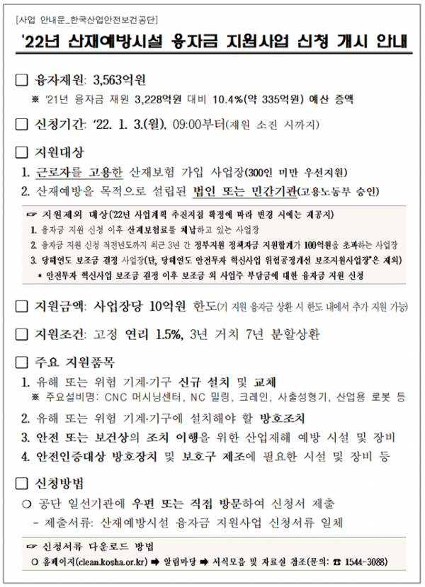 안전보건공단 관계자는 “2022년은 중대재해처벌법이 시행되며 ESG 경영 등 기업의 안전보건 경영이 중요시되는 해”며 “공단은 자금조달에 어려움을 겪는 사업장에 재정 지원해, 산업현장의 안전보건관리체계 구축과 재해예방에 기여하겠다”고 밝혔다.