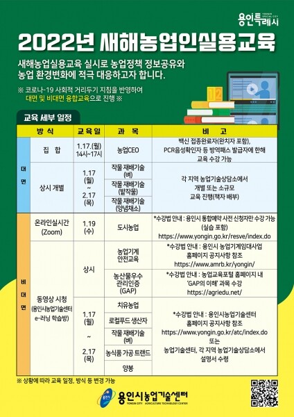 시는 이 가운데 농산물우수관리인증 도시농업 로컬푸드 생산자교육 등 강의 영상을 제작해 용인시농업기술센터 e-러닝 학습방에 게시한다.
