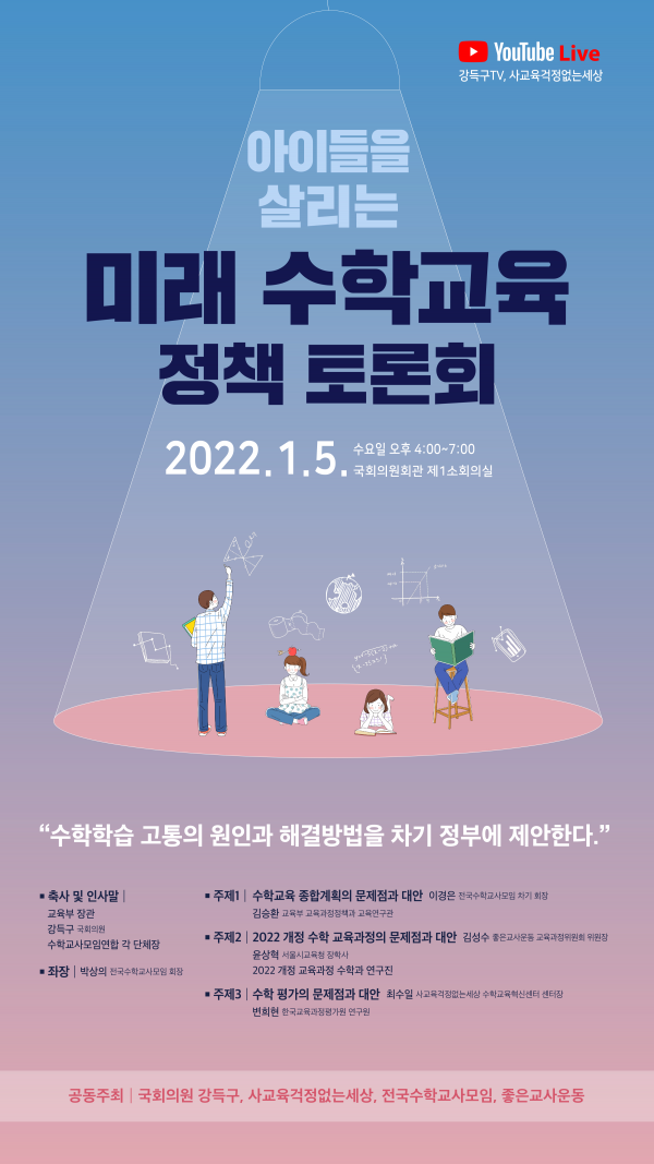 이어서 오후 오후 4시, 각계각층의 교육전문가와 함께 논의하는 ‘미래 수학교육 정책 토론회’를 통해 수학학습 고통의 원인을 진단하고 문제점에 대한 개선책 및 대안을 차기 정부에 제안할 예정이다.