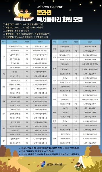 시 관계자는 “독서동아리는 매년 모집과 동시에 마감될 정도로 주민들에게 큰 사랑을 받고 있다”며 “동아리 활동을 통해 함께 책 읽는 기쁨을 누려보시길 바란다”고 말했다.