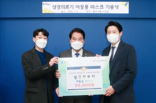 6일 용인시청에서 열린 기탁식에는 센터 이사장을 맡고 있는 백군기 용인시장과 이성우 성경의료기 대표 등이 참석했다.