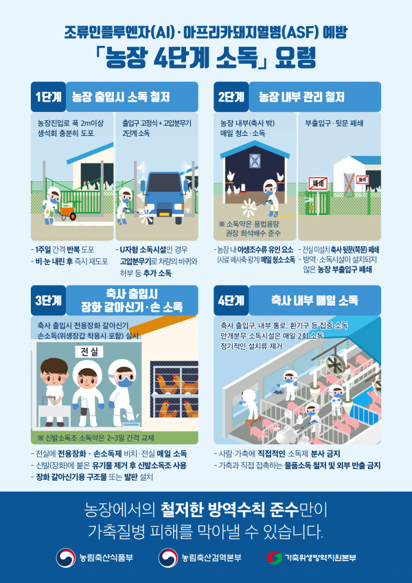 중수본은 “겨울철 추워진 날씨로 소독장비가 얼거나 동파될 수 있어 매일 정상 작동 여부를 점검하고 하루 중 기온이 높아 소독효과가 좋은 오후 2~3시에 집중 소독을 실시해 줄 것”을 강조했다.