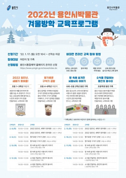 용인시박물관 관계자는 “이번 프로그램을 통해 어린이들이 즐겁고 알찬 겨울방학을 보낼 수 있길 바란다”며 “많은 관심과 신청 바란다”고 말했다.