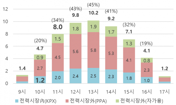 전력피크시 전력시장에서 계량되는 태양광발전 비중은 1.5%로 나타나지만, 실제 전력피크시 전체 태양광발전 비중은 9.4%에 달한다.