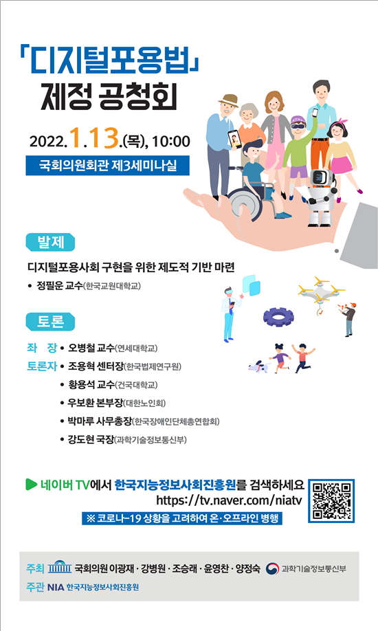 국회와 정부는 사회 전반에 법안 필요성에 대한 인식을 제고하기 위해 이번 공청회를 공동 개최하게 됐으며 대한노인회, 장애인 협회·단체 등도 공청회에 참여해 키오스크 이용, 큐알체크인 등이 확산되는 상황에서 디지털 취약계층을 위한 법안·정책에 대해 제언할 예정이다.