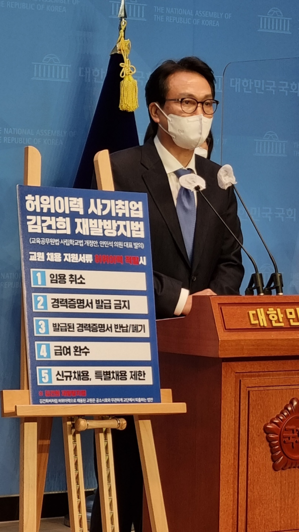 11일 국회 소통관에서 기자회견을 열고 “국민적 공분을 사고 있는 김건희 씨의 허위이력 문제는 채용 자격과 심사 점수 기분에 영향을 미치기 위해 고의적으로 저지른 반교육적인 불법 사기 취업”이라며 “김건희 방지법을 추진해 공정한 채용시스템을 마련하겠다”고 법안 발의의 취지를 밝혔다.