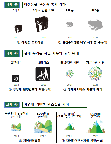자연보전 분야에서 올해 중점적으로 추진하는 과제는 야생동물 보전과 복지 강화, 함께 누리는 자연 치유와 휴식 확대, 자연에 기반한 탄소중립 기여 등으로 주요 내용은 다음과 같다.