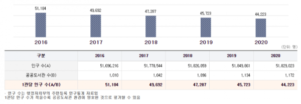 이를 통해 공공도서관 1관당 봉사인구 수는 지난해보다 1천 명 적은 4만 3천 명이 될 것으로 보인다.
