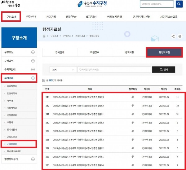 구는 2018년부터 2021년까지 사용승인된 39곳의 보험증권은 지난 7일 홈페이지에 공개했다.