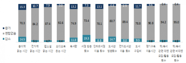 이번에 처음으로 조사한 ‘코로나19 발생 이후 독서 생활 변화’에 대해, 성인은 대체로 큰 변화가 없다고 응답했으나, 학생의 경우 ‘독서량’, ‘종이책 독서 시간’이 증가했다는 응답이 40% 이상이었다.