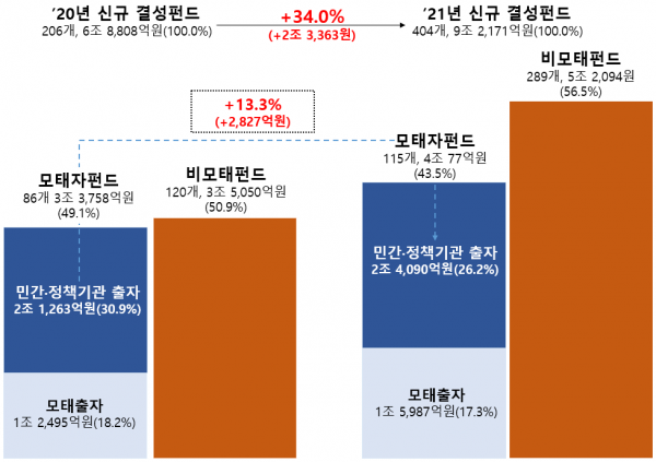 결성금액 기준으로 보면 ’21년도 전체 기금 결성 대비 모태자기금 비중은 전년 대비 감소하였지만, 모태기금가 견인한 민간·정책 기관 출자금액은 오히려 2,827억원 늘어 모태기금가 마중물 역할을 톡톡히 한 것으로 나타났다.