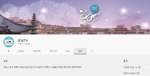 2012년 개설해 올해로 10년차인 유튜브‘성남TV’는 다양한 장르의 고퀄리티 영상을 제작· 홍보해 현재 1만 2천명의 구독자를 보유해 1년새 64%의 괄목할 성장을 보였다.