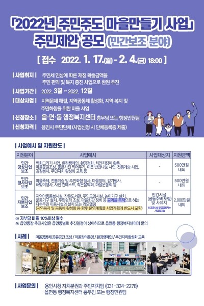 올해는 ‘용인형 주민주도 마을만들기 사업’으로 명칭을 변경하고 주민 불편 해소와 지역 복지 및 지역공동체 활성화를 위해 주민들이 직접 제안하는 사업을 읍·면·동장이 추진하는 방식과 주민단체가 직접 추진하는 방식으로 진행한다.