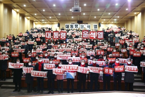 대선을 앞두고 본격적인 선거운동에 임하기 위한 영천·청도 당협 선대위 출범 및 윤석열 대선 후보의 승리를 결의하기 위해 마련된 이번 행사는 코로나19 방역수칙 준수를 위해 국민의힘 당원 중에서도 백신접종 완료자를 참석 대상으로 한 가운데 299명의 당원이 참석해 매우 뜨거운 열기 속에서 정권교체의 강한 열망을 확인할 수 있었다.