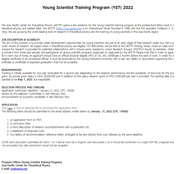 지원 서류, 처우, 지원 방식 등의 세부 사항은 아태이론물리센터 홈페이지 및 외부 공고처를 통해 확인할 수 있다.