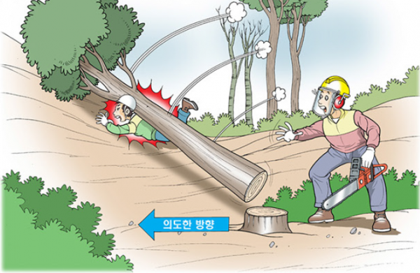 벌목작업 시 인접 수목·지형·풍속 등을 고려해 안전한 방향을 선택하고 충분한 수구 및 노치각을 만들어 목재의 쪼개짐이 없이 완전히 쓰러지도록 절단한다.