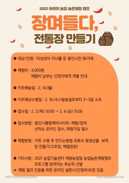 이 프로그램은 코로나19로 인해 어린이들을 위한 체험 프로그램이 대폭 줄어든 상황에서 색다른 경험을 제공하기 위해 마련됐으며 현장체험 대신 ‘장만들기 키트’를 배송받아 유튜브를 통해 담그기 체험을 공유하는 방식으로 진행된다.
