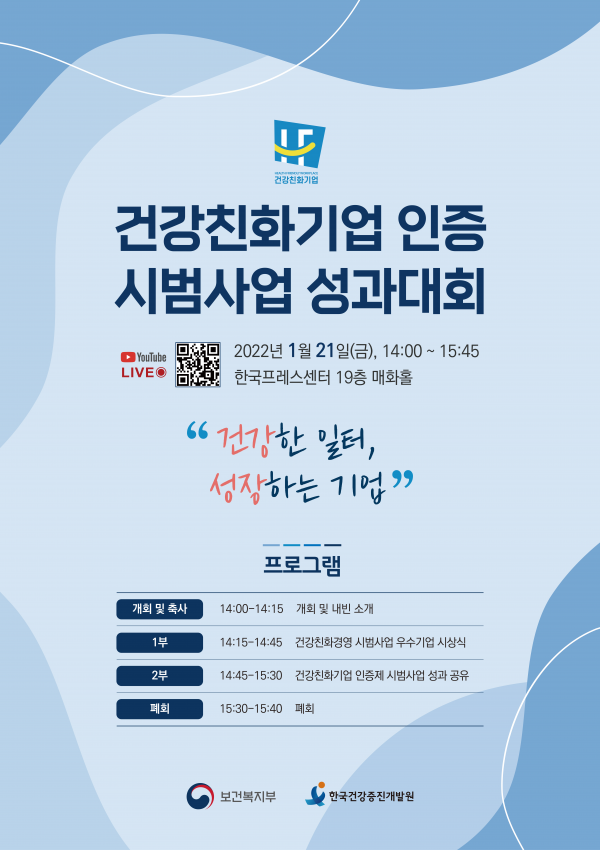 직장 내 문화와 환경을 건강 친화적으로 조성하고 직원 스스로 건강관리를 적극 수행할 수 있도록 지원하는 등 건강친화제도를 모범적으로 운영하고 있는 기업에 인증을 부여하는 제도 이번 성과대회는 코로나19 방역을 위해 최소 인원만이 현장에 참석하며 건강친화기업 인증제도에 관심 있는 국민 누구나 참여할 수 있도록 한국건강증진개발원 유튜브 채널에서 생중계 예정이다.