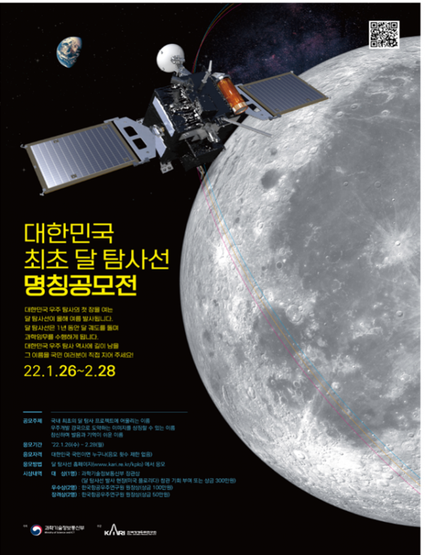 과기정통부 권현준 거대공공연구정책관은 “달 궤도선은 성공 시 우리나라는 세계 7번째 달 탐사 국가로서 우주탐사 역사에 첫 발을 내딛게 될 것”이라고 밝히면서 “이번 명칭 공모전에 큰 관심과 참여를 부탁드린다”고 말했다.