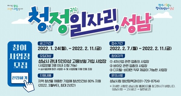 성남시 청년정책과 관계자는 “코로나19로 어려움을 겪는 기업의 부담을 덜어주고 지역 청년에게는 양질의 일자리를 제공하기 위해 추진하는 사업”이라고 말했다.