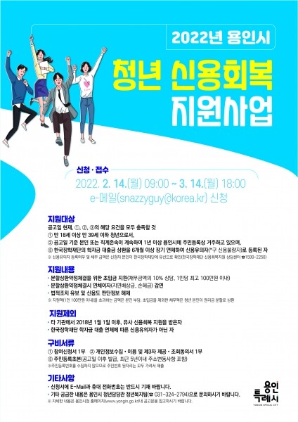 지원 대상은 학자금 대출 장기 연체로 한국장학재단에 신용도 판단 정보가 등록된 만 39세 이하 청년으로 본인이나 부모가 용인시에 주민등록을 두고 1년 이상 거주 중인 시민이다.
