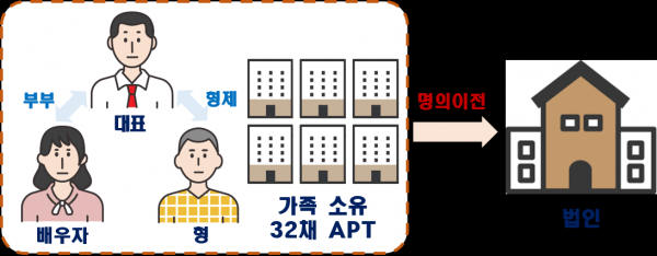 가족 소유 저가아파트 32채를 본인이 대표인 법인에게 일괄매도하면서 대금 수수가 없고 법인이 납부해야 할 취득세를 본인이 부담하는 등 법인 명의신탁이 의심되어 경찰청에 수사의뢰한다.