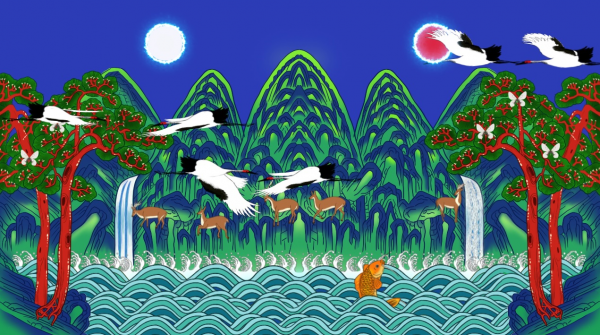 이번 전시는 해와 달, 다섯 개의 산봉우리, 한 쌍의 폭포, 그리고 네 그루의 소나무 등이 좌우대칭으로 그려져 있는 조선시대 작품인 일월오봉도 배경의 미디어아트로 자연의 생동감을 표현하기 위해 해와 달의 상징을 빛의 효과 등으로 연출해 몰입도를 극대화했고 산봉우리 아래에는 파도의 출렁임과 두루미의 움직임, 그리고 사슴 모시나비 잉어 등의 동물을 새로 삽입하고 행동을 부여해 자연과 그 속에 뛰어노는 생물의 생동감을 연출했으며