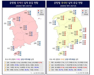국내선 여객은 인천을 제외한 대부분의 공항에서 전년 대비 증가했고 팬데믹 확산 이전인 ‘19년과 비교하면 김포·김해·여수 등은 증가하였지만 제주·대구·인천은 감소했다.