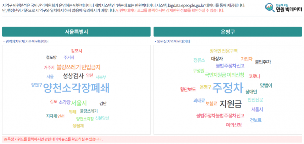 충청북도, 시흥시 등 지방자치단체는 민원 키워드 정보와 통계자료를 활용한 시스템을 구축해 민원 현황을 주민들에게 공개하고 민원 동향을 파악해 주민 불편 해소를 위한 정책의 기초자료로 활용하고 있다.
