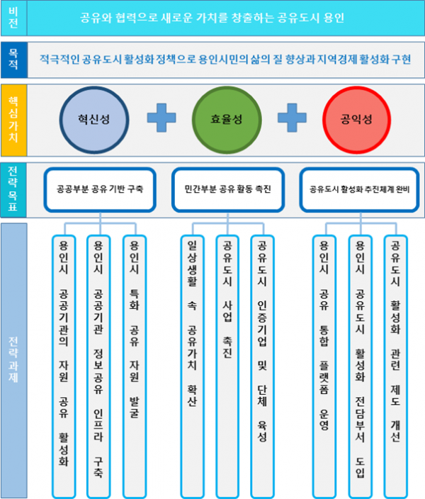 용인시 공유도시 활성화를 위한 3개 전략목표는 공공부분 공유 기반 구축, 민간부분 공유 활동 촉진, 공유도시 활성화 추진체계 완비로 정했다.