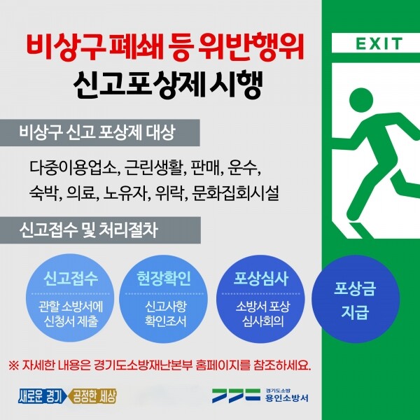 신고 방법은 불법행위에 대한 사진이나 동영상을 촬영 후 48시간 이내에 용인소방서 홈페이지‘비상구 신고센터’를 통해 온라인 접수하거나, 방문·우편·팩스 등의 오프라인 접수도 가능하다.