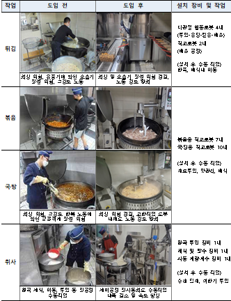 이번 시범보급사업은 그 첫 번째 성과로 조리병이 가장 애로로 꼽는 튀김, 볶음, 국·탕, 취반 등 4개 작업의 로봇활용 표준모델을 개발해 보급하는 사업이다.