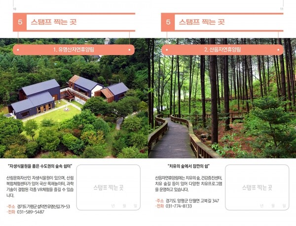 - 기존에 배포된 스탬프 책자는 유지 / 단, 신규 배포는 중지또한 ‘주중 스탬프 투어’ 책자를 받고자 할때는 국립자연휴양림 공식 블로그를 통해 2월7일부터 2월20일까지 사전신청을 하면 방문하는 휴양림에서 직접 수령이 가능하며 선착순 2,000명에게 배부할 계획이라고 전했다.