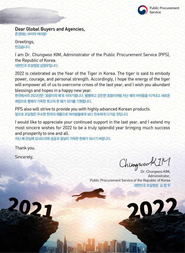 김정우 조달청장은 “지난해 코로나 확산에도 불구하고 전문·효율화된 사업지원, 기업부담 완화 등 제도개선과 함께 범정부 협력체계 구축으로 해외진출 성과가 크게 확대됐다”며 “올해도 수출지원 중심에서 개발협력 분야 등으로 지원 영역을 확대하고 글로벌 전문인력 양성을 내실화하는 등 우리기업의 해외조달시장 진출 확대를 위해 최선을 다하겠다”고 말했다.