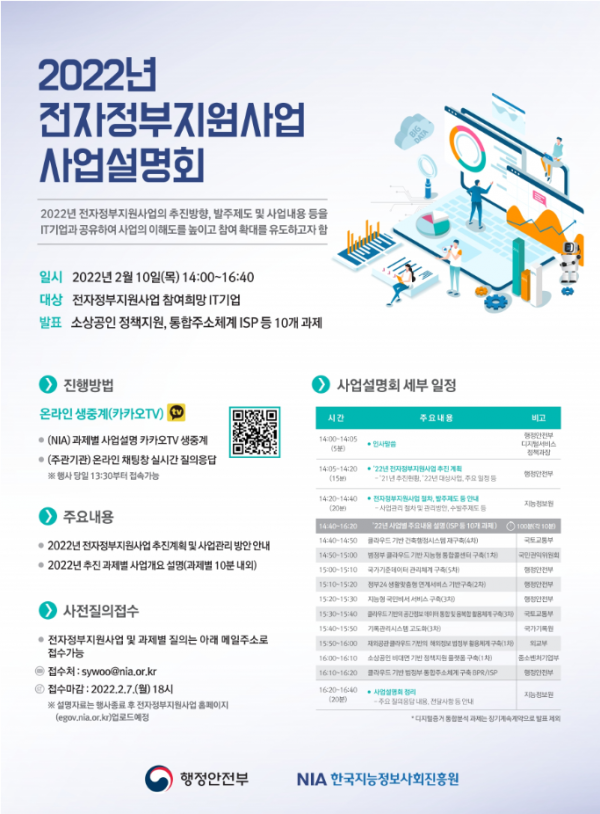 2022년 전자정부지원사업 11개 사업과제는 국민에게 필요한 서비스를 선제적·맞춤형으로 제공하는 대국민 서비스 5개 과제 행정처리 및 대민서비스 제공의 기반이 되는 행정서비스 6개 과제로 구성됐으며 클라우드, 인공지능, 빅데이터 등의 신기술이 적용된다.