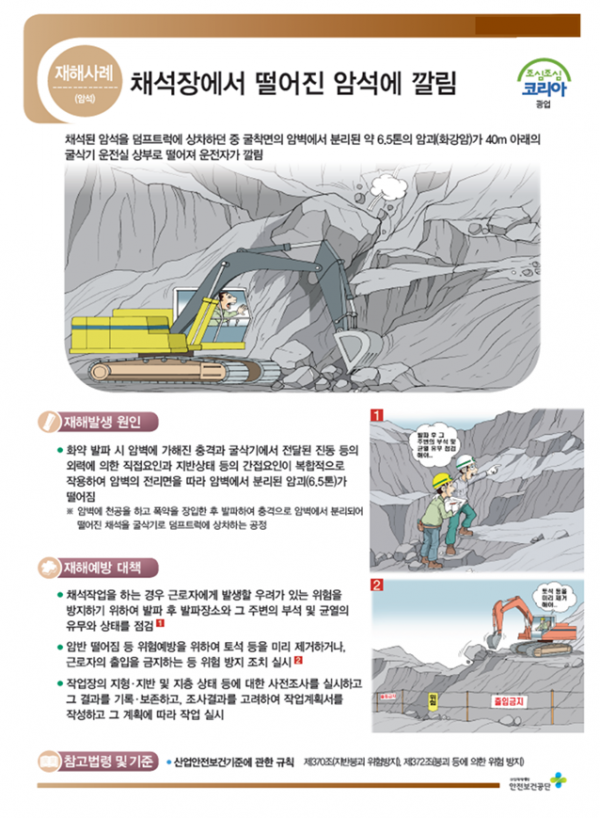특히 채석장에는 채석작업 관련 반복 사고사례와 안전한 작업을 위한 자체 점검표를 배포하고 당분간 패트롤 점검을 병행하며 자체 점검을 독려할 계획이라고 전했다.