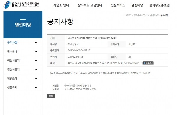 수질 정보가 공개되는 하수처리장은 일일 500톤 이상을 처리하는 수지·용인·기흥·구갈· 모현·상현·영덕·천리·서천·아곡·고매·백암·송전·남사·추계·동부 등 16곳이다.
