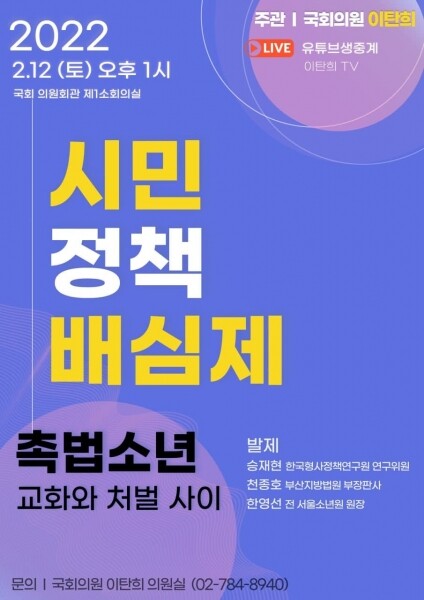 이탄희 의원은 “촉법소년은 대선 공약으로 대두될 만큼 사회적 관심이 뜨거운 사안”이라며 “각계각층서 모인 시민배심원들이 토론을 거친 뒤 어떤 선택을 내릴지 매우 궁금하다”고 말했다.