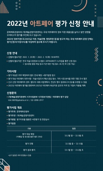 올해 정부 지원을 받거나 내년도 ‘아트페어 육성 지원 사업 공모’ 신청 자격을 얻기 위해서는 ‘2022년 아트페어 평가’에 참여해야 한다.