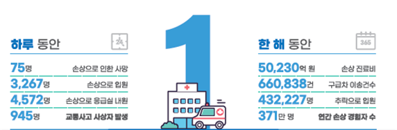 손상 사망자는 하루 평균 75명이었고 손상으로 응급실에 방문하는 환자는 5천명 수준이었다.