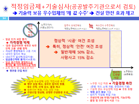? 두 번째 발제에서는 ‘적정임금제’가 도급 중 임금 삭감을 억제해 적정공사비의 확보 및 전달을 통한 건설현장 정상화를 가능케 하는데, 이미 미국에서 그 성과를 입증한 바 있고 국내에서도 서울시를 비롯한 여러 시범사업을 통해 성공 가능성이 확인되었으므로 조속한 확대 시행이 필요하다고 강조했고 제도 추진의 방향과 기반 마련에 대해 논의됐다.
