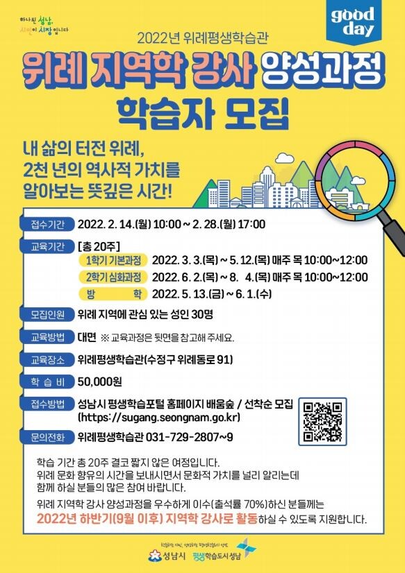 참여하고 싶은 시민은 2월 14일부터 2월 28일까지 성남시 평생학습 통합플랫폼 ‘배움숲’에서 신청하면 되며 자세한 사항은 배움숲을 참고하거나, 위례평생학습관으로 문의하면 된다.
