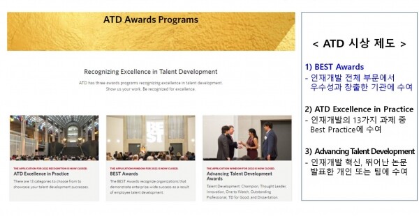 한편 시상식은 오는 5월 미국 플로리다주 올랜도에서 개최되는 세계 최대의 인재개발 행사인 ‘2022 인재개발협회 학술회의’에서 진행될 예정이다.
