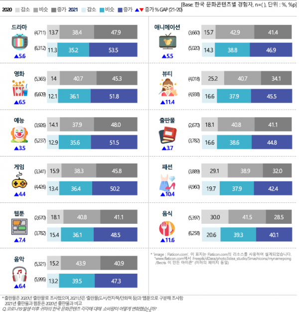 조사 결과, 코로나19 장기화로 인한 경기 침체에도 불구하고 전체 문화콘텐츠 소비 중 한류 콘텐츠가 차지하는 소비 비중과 규모는 늘어났다.