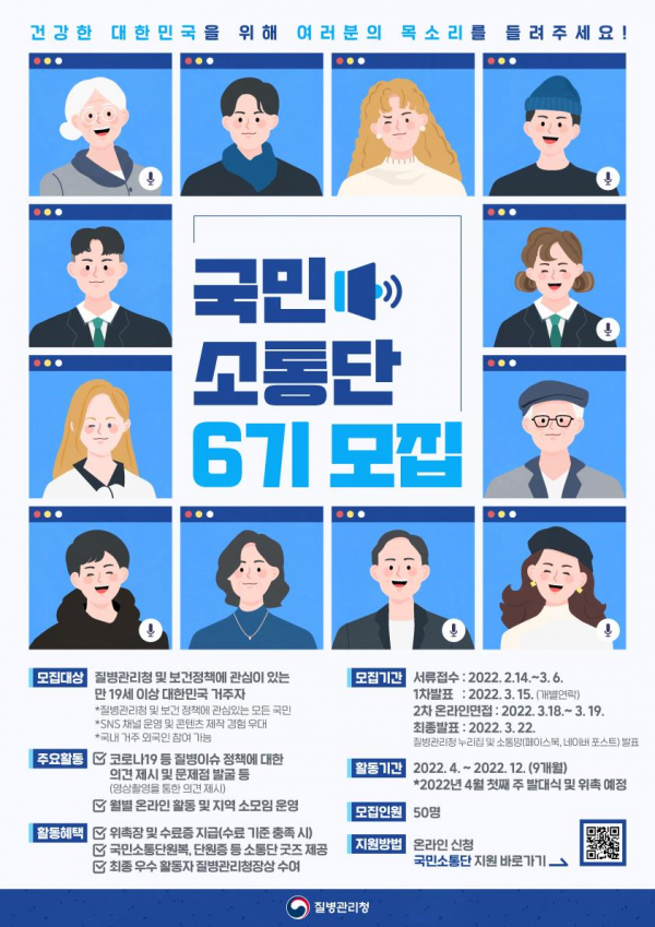 희망자는 질병관리청 누리집 및 누리소통망을 통해 2월 14일부터 3월 6일까지 온라인으로 신청 가능하며 비대면 면접을 통해 최종 50인이 선정된다.